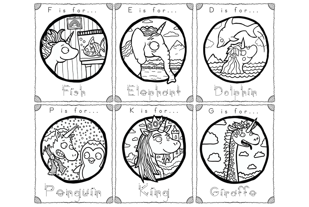 There are 26 Unicorn colouring pages with a related word to trace underneath.